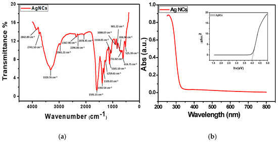 The FTIR graph in Figure 3a displays noticeable peaks, which represent the distinct fingerprints of the AgNCs. Prominent peaks are seen for various stretches of bonds in the FTIR analysis. The peak at 3319.76 cm−1 represents the N-H stretch, 2078.45 cm-1 is assigned to C-H stretching vibrations, and 1591.15 cm−1 corresponds to the stretching vibration of the C=C bond. The peak at 1118.05 corresponds to C=O. 1392.54 cm−1 corresponds to C-C and C-N stretching, while 1118.05 cm-1 is assigned to the –C= bond, and 732.82 cm−1 and 614.75 cm−1 are for the C-H out-of-plane bend and CH bending vibrations, respectively. These peaks are comparable to unique fingerprints of silver nanomaterial, as found in the literature [22,23]. It was determined, through the utilization of UV–visible spectroscopy, that the prepared materials are nanoparticles. Figure 3b shows the plot of the absorption spectrum and Tauc’s plot obtained from the UV-Vis spectroscopic analysis of the AgNCs over a range of 200 to 800 nm. The optical band gap energy (Eg) of the AgNCs can be obtained from the Tauc plot or calculated using Tauc’s equation [24], which illustrates the relationship between the absorption coefficient and the incident photon energy of the material. Tauc’s equation is expressed as