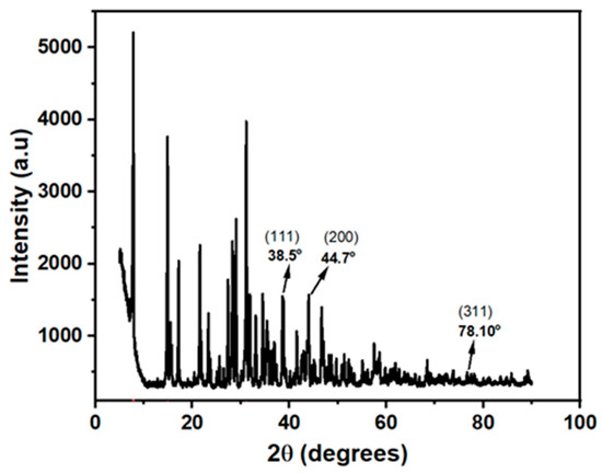 The diffraction pattern of the powdered AgNCs shows sharp and well-defined diffraction peaks at 2θ = 38.5°, 44.7°, and 78.1°, which can be assigned to the (111), (200), and (311) reflections of the face-centred cubic (FCC) structure of pure metallic silver, respectively. This diffraction pattern is consistent with JCPDS File No 04-0783 and the literature report [26,27,28]. The produced silver nanoparticles’ outstanding crystallinity is confirmed by these distinct, strong peaks in the diffraction pattern.