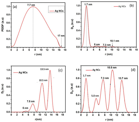 Figure 5a–d show the small-angle X-ray scattering (SAXS) analysis which was used to probe the internal composition of the synthesized nanoparticles; they show the internal structure (a), the size distribution by number (b), the size distribution by intensity (c), and the size distribution by volume (d), respectively. As observed in these figures, most of the particles appear at 1.7 nm radius (b) with a maximum diameter of 17 nm (a). The nanoparticles showed a maximum size distribution by intensity at 13.5 nm (c), and they also exhibited a spherically shaped internal structure (a), which is expected. The large number of small particles of 2 to 8 nm is particularly advantageous in increasing the surface area of the interaction layer by adhering reactant pathogen species to the layer.