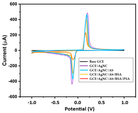The immunosensor development steps were characterized using CV in 10 nM PBS of pH 7.4 in the potential window −1.0 to 1.0 and at a scan rate of 50 mV/s. Figure 6 shows the CV plots of the bare GCE, GCE|AgNC, GCE|AgNC|Ab, GCE|AgNC|Ab|BSA, and GCE|AgNC|Ab|BSA|PSA. The bare GCE in Figure 6 shows no response. When AgNCs were introduced on the bare GCE, there was a significant amplification of the signal, with prominent peaks at 0.25 V, and −0.125 V, which are associated with the oxidation of Ag from Ag0 to Ag+ and its reduction from Ag+ back to Ag0. Thus, the GCE|AgNC possesses a significantly higher surface area compared to the GCE. This increased surface area allows for a greater number of antibodies to be immobilized on the electrode surface.