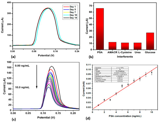 To study the stability of the prepared immunosensor, the current response was assessed by SWV in 10 mM PBS after one day, five days, seven days, ten days, and fourteen days of storage at 4 °C. The current response was observed as 100% after day one, 99.85% after day five, 99.42% on day seven, 99.13% on day ten, and 98.26% by day fourteen. From these results, the current response after fourteen days of storage decreased by only 1.74% (Figure 7a). This marginal current decrease confirms good stability, of 98.26%. This enhanced stability could be attributed to strong antibody–nanoparticle interactions, which may have helped minimize the degradation. To investigate the sensor’s selectivity, the interfering agents introduced were glucose, urea, L-cysteine, and alpha-methyl acyl-CoA racemase (AMACR). All these interferents are found in the blood, and were used in a 1:1 ratio to test their impact on the sensor response. The sensor GCE|AgNC|Ab|BSA|PSA was run in 10 mM PBS of pH 7.4 in the presence of 10 ng/mL of the interfering species. The current response shows that the immunosensor was selective to PSA (67%) and was not significantly affected by the interferents, whose response is between 10 to 11%, except for glucose, with a response at 27% (Figure 7b). The reproducibility of the proposed immunosensor was interrogated by measuring the current response of 10 ng/mL of PSA using four different immunosensors prepared from different electrodes under the same experimental conditions. A relative standard deviation (RSD) of 5% was calculated for the measurements, confirming that the proposed method was repeatable and analytically significant. In summary, these results show that the fabricated immunosensor produced overall good stability, reproducibility, and selectivity.