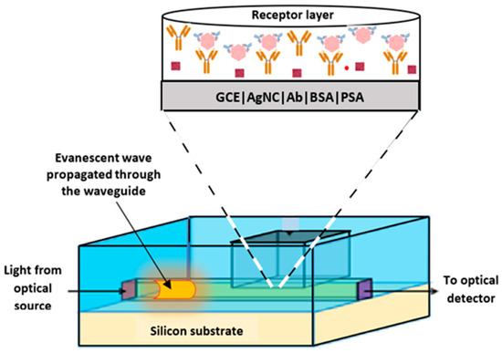 Silver nanoparticles significantly enhance the sensitivity of immunosensors through several mechanisms that leverage their unique chemical and physical properties. They have a high surface area relative to their volume, allowing for increased binding sites for target biomolecules [15]. Their signal amplification capabilities are due to their ability to dissolve in certain systems and to release silver ions (Ag+), which can then interact with fluorescent probes or other signalling molecules to significantly amplify the detectable signals [16]. They exhibit excellent electrocatalytic properties, which improve the electrochemical response of immunosensors [15]. Their ability to facilitate electron transfer enhances the sensitivity of electrochemical detection methods, allowing for lower limits of detection compared to conventional techniques. The unique optical properties of silver nanoparticles enable surface plasmon resonance, which enhances the optical signals in biosensing applications [15]. Furthermore, the inherent antimicrobial properties of silver nanoparticles help maintain sensor performance by reducing contamination risks during assays [16]. Finally, their versatility in functionalization ensures that silver nanoparticles can be easily functionalized with various biomolecules (e.g., antibodies), allowing for tailored sensor designs that enhance specificity and sensitivity for particular targets [15]. This is crucial for developing highly specific immunosensors capable of detecting a wide range of biomarkers. These advantages make silver nanocrystals a valuable component in developing advanced biosensing technologies for clinical diagnosis and other applications requiring high sensitivity and specificity. In our previous study on nanomaterial-enhanced receptor technology for silicon on-chip biosensing applications [17,18], we demonstrated the successful integration of both basic and advanced micro- and nanoscale sensors onto silicon substrates by leveraging silicon avalanche-mode light-emitting devices (Si-AMLEDs) in conjunction with standard silicon integrated-circuit fabrication techniques. These sensors could detect a range of physical and biochemical parameters through mechanisms involving waveguide optics, evanescent field interactions, and waveguide-integrated receptor layers. Furthermore, we proposed that the incorporation of nanomaterials within the receptor cavity could enhance the selectivity and sensitivity of the biosensing platform. Building upon this foundational work, the present study introduces a novel electrochemical immunosensor for the quantitative detection of prostate-specific antigen (PSA), employing silver nanocrystals (AgNCs) as signal amplification agents. This sensor is designed with future integration into a silicon photonic microchip in mind, enabling rapid, point-of-care diagnostic applications. The innovation of this work lies in the strategic use of AgNCs to enhance signal transduction within the receptor cavity, thereby facilitating their potential incorporation into Si-AMLED-based biosensing systems.