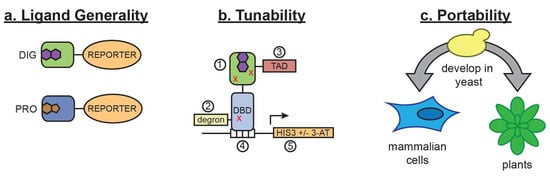 - Feng, J.; Jester, B.W.; Tinberg, C.E.; Mandell, D.J.; Antunes, M.S.; Chari, R.; Morey, K.J.; Rios, X.; Medford, J.I.; Church, G.M.; et al. A general strategy to construct small molecule biosensors in eukaryotes. eLife 2015, 4, e10606. [Google Scholar] [CrossRef]