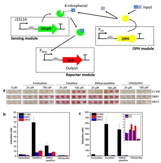- Chong, H.Q.; Ching, C.B. Development of Colorimetric-Based Whole-Cell Biosensor for Organophosphorus Compounds by Engineering Transcription Regulator DmpR. Acs Synth. Biol. 2016, 5, 1290–1298. [Google Scholar] [CrossRef] [PubMed]