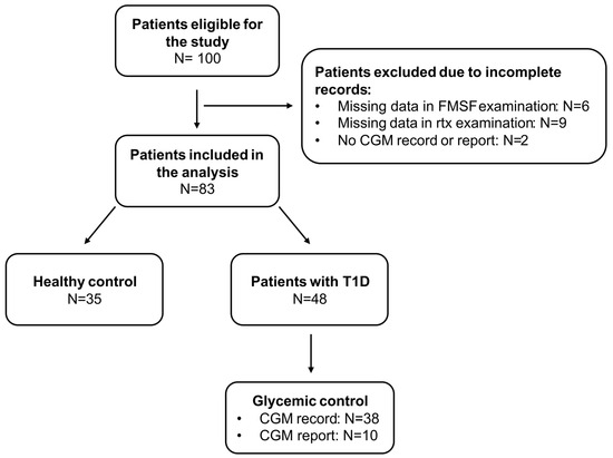 Summary of study group recruitment process. T1D—type 1 diabetes; CGM—continuous glucose monitoring; FMSF—flow-mediated skin fluorescence.