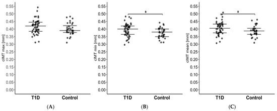 Comparison of carotid intima-media thickness for the (A) cIMTmax, (B) cIMTmin, and (C) cIMTmean between patients with T1D and healthy subjects. The middle line displays the median, whereas the whisker spans the lower and upper quantiles. The statistically significant differences are marked with “*”. T1D—type 1 diabetes; cIMTmax—highest value of carotid intima-media thickness from both artery measurements; cIMTmin—lowest value of carotid intima-media thickness from both artery measurements; cIMTmean—mean value of carotid intima-media thickness from both artery measurements.