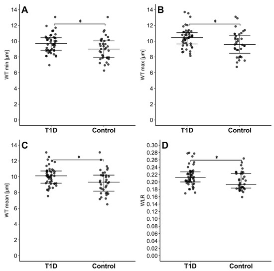 Comparison of adaptive optics retinal camera examination of the (A) lowest wall thickness, (B) highest wall thickness, (C) mean wall thickness, and (D) wall-to-lumen ratio results between patients with type 1 diabetes (T1D) and healthy subjects. The middle line displays the median, whereas the whisker spans the lower and upper quantiles. The statistically significant differences between the groups are marked with “*”. T1D—type 1 diabetes; WTmin—lowest measurement of both wall thicknesses; WTmax—highest measurement of both wall thicknesses; WTmean—mean value from both wall thickness measurements; WLR—wall-to-lumen ratio.