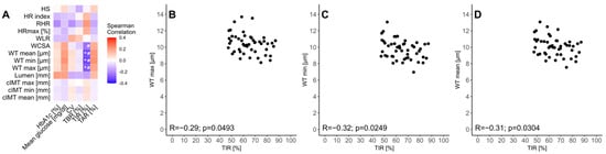 Correlation heatmap (A) of glycemic control parameters and carotid intima-media thickness (cIMT), flow-mediated skin fluorescence (FMSF), and adaptive optics retinal camera (Rtx) examinations, as well as scatter plots (B–D) presenting the relationship between the time in range (70–180 mg/dL) and adaptive optics retinal camera examination results for the (B) highest wall thickness, (C) lowest wall thickness, and (D) mean wall thickness in patients with type 1 diabetes (T1D). Statistically significant correlations are denoted by ‘*’, whereas statistically significant correlations adjusted with T1D duration are marked with ‘#’. cIMTmax—the highest value of carotid intima-media thickness from both artery measurements; cIMTmin—the lowest value of carotid intima-media thickness from both artery measurements; cIMTmean—mean value of carotid intima-media thickness from both artery measurements; HR—hyperemic response; RHR—reactive hyperemia response; HS—hypoxia sensitivity; WTmin—lowest measurement of both wall thicknesses; WTmax—highest measurement of both wall thicknesses; WTmean—mean value from both wall thickness measurements; WLR—wall-to-lumen ratio; WCSA—wall cross-section area; TIR (70–180)—time in range (70–180 mg/dL); TBR (<70)—time below range (<70 mg/dL); TAR (>180)—time above range (>180 mg/dL); CV—coefficient of variability; HbA1c—hemoglobin A1C.