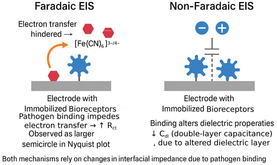 Faradaic EIS is most often carried out with a freely diffusing redox mediator that shuttles electrons between the working electrode and solution [67]. The anionic ferri/ferrocyanide couple ([Fe(CN)6]3−/4−) is widely used because of its fast outer-sphere electron-transfer kinetics; however, its negative charge can be electrostatically repelled by surfaces that carry net negative charge after biofunctionalization (for example, DNA or sialylated antibodies). In such cases, markedly higher baseline Rct values and compressed signal windows are observed. A convenient remedy is to replace or complement ferri/ferrocyanide with a cationic mediator—most prominently hexaammineruthenium(III/II) chloride ([Ru(NH3)6]3+/2+), ferrocenyl-trimethyl-ammonium, or the metallocene methylene-blue cation. Attractive electrostatic interaction lowers the initial Rct, while target binding that introduces additional steric hindrance or charge shielding still produces a clear ΔRct. Recent studies with DNA hybridization sensors and IgG immunosensors report up to twofold improvements in sensitivity after substituting RuHex for ferri/ferrocyanide, without compromising linearity or stability [68,69]. Conversely, when the recognition layer is positively charged (e.g., poly-l-lysine or cationic peptides), an anionic probe remains advantageous. This increase in Rct is typically observed as an enlargement of the diameter of the semicircle in the Nyquist plot [70]. The magnitude of this increase in Rct is generally proportional to the amount of pathogen bound to the surface, thus allowing for quantitative detection. In some cases, the binding event might also affect the diffusion of the redox probe, leading to changes in the ZW. The distinct mechanisms of signal generation in Faradaic and non-Faradaic EIS biosensors are summarized in Figure 1. In Faradaic systems, electron transfer from a redox probe is modulated by steric and insulating effects introduced by pathogen binding, leading to increased Rct. In contrast, non-Faradaic systems respond to changes in the interfacial dielectric environment, manifested as a decrease in Cdl. These processes enable sensitive detection without the need for external labels, leveraging impedance changes as direct indicators of biorecognition events.
