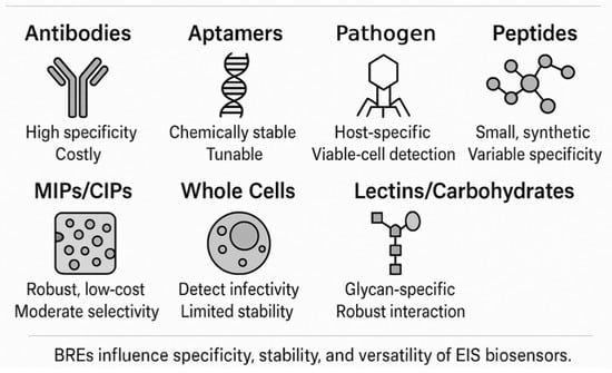 Visual summary of the major types of BREs employed in EIS-based pathogen biosensors. Each class—antibodies, aptamers, phages, peptides, MIPs/CIPs, whole cells, and lectins/carbohydrates—exhibits distinct physicochemical characteristics, advantages, and limitations that influence biosensor specificity, stability, cost, and viability-based detection capacity.