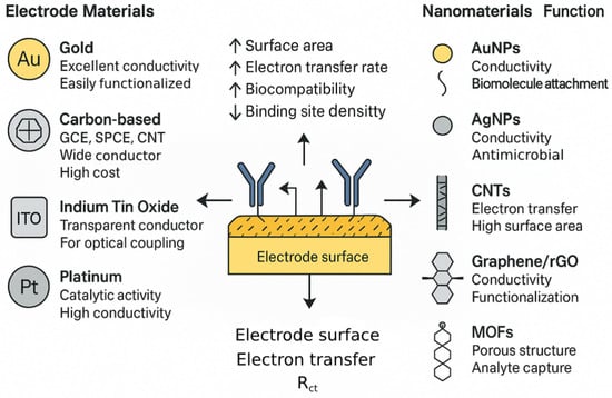 Schematic representation of the integration between electrode materials and nanomaterials in label-free EIS-based pathogen biosensors. Common electrode substrates, such as gold, carbon-based materials, ITO, and platinum, are shown with their key properties. Nanomaterials including AuNPs, AgNPs, CNTs, graphene derivatives, and MOFs enhance sensor performance through an improved surface area, electron transfer, biocompatibility, and functionalization capacity.