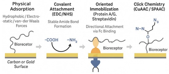 Representative strategies for immobilizing BREs on electrode surfaces in EIS-based biosensors. The illustration compares physical adsorption, covalent attachment via EDC/NHS chemistry, encapsulation in hydrogel or polymer matrices, oriented immobilization (e.g., via Protein A/G or streptavidin-biotin systems), and click chemistry (CuAAC/SPAAC). Each approach differs in stability, orientation control, and compatibility with specific biorecognition elements.