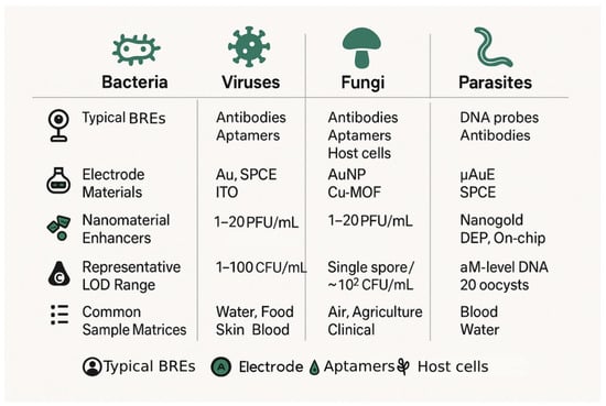 Comparative overview of EIS biosensor design strategies across bacterial, viral, fungal, and parasitic pathogens. Key features include typical biorecognition elements, common electrode materials, enhancement nanomaterials, representative detection limits, and example sample matrices.