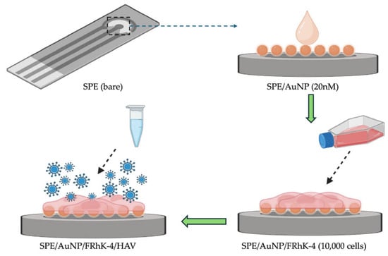 Electrode preparation steps, including the drop-cast deposition of AuNP on bare SPEs, followed by the immobilization of FRhk-4 cells and subsequent testing with HAV [148].