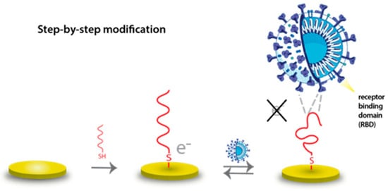 The recent SARS-CoV-2 pandemic spurred the rapid development of EIS biosensors. Numerous immunosensors targeting viral proteins, such as the nucleocapsid (N) protein or the spike protein’s receptor-binding domain (RBD), have been described. For instance, an EIS immunosensor using gold nanostructured screen-printed carbon electrodes (AuNS/SPCEs) functionalized with anti-N-protein antibodies achieved an LOD of 6 pg/mL for N-protein in saliva samples, with detection possible in under 30 min, including sample processing [30]. Another platform used RBD-coated electrodes for the rapid detection (less than five minutes) of anti-SARS-CoV-2 antibodies in serum [150]. Aptamer-based EIS sensors have also been developed for the SARS-CoV-2 S-RBD protein (Figure 7), with one example showing an LOD of 132 ng/mL [79].