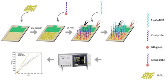 - Nguyen, T.N.P.; Nguyen, S.H.; Tran, M.T. Disposable Impedance Sensors Based on Novel Hybrid MoS2 Nanosheets and Microparticles to Detect Escherichia Coli DNA. PLoS ONE 2024, 19, e0299272. [Google Scholar] [CrossRef]