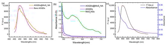 Further, the UV-vis spectrum of bare AGQDs, MoS2 NSs, and AGQDs@MoS2 was obtained to confirm the stable nanoassembly formation. The optical characteristics of the MoS2 dispersion, like other typical TMDCs, consist of four trigonal prismatic characteristic peaks [] which disappeared after the formation of nanoassembly AGQDs@MoS2NSs, as shown in Figure 1b. A representative of 2D nanomaterials with a large surface area and magnified ability to absorb light. MoS2 is particularly sensitive to light with a wavelength of 450 nm []. A variety of active pots that can serve the binding of carbon dots with other forms of nanomaterials to produce multifunctional nanoassemblies []. The decrease in fluorescence of AGQDs after the adsorption to the MoS2 nanosheets is a graphene dots behavior. When it covalently couples or electrostatic interactions with inert metals, metallic NPs, QDs, MOFs, LTMDs, etc. Figure 1c shows a gradual decrease in the fluorescence emission intensity at 450 nm after the formation of AGQDs@MoS2NSs nanoassembly, which indicates strong absorption by MoS2 nanosheets and confirms efficient Förster resonance energy transfer (FRET) from AGQDs to MoS2. There is a wide-ranging overlap of the spectra between the absorbance spectra and PL-spectra of the AGQDs observed in Figure 1c. The spectral overlap of the donor’s emission spectrum and the acceptor’s absorption spectrum is observed when photoexcited CDs (energy donor) return to the ground state orbital while simultaneously providing energy to excite other nanomaterials (energy acceptor) in the FRET system of CDs-based nanoassembly []. Good quantum yield is due to the photoemissive property of the fluorescent materials. The emission spectrum of AGQDs was measured between 350 and 700 nm. This spectral overlapping is an obligatory factor for the probe and quencher pairing of FRETS. The efficient quenching is due to the broad absorbance spectrum of MoS2 within the range of emission of AGQDs.