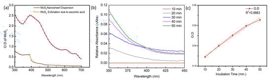 Optical characterization is applied to observe the effects of ascorbic acid on the MoS2 NSs. The relationship between the increased optical density of the ascorbic acid and its relative effect to cause exfoliation of MoS2 NSs is observed. The disappearance of characteristic peaks of MoS2 is visibly seen in Figure 2a. As a weak reductant, ascorbic acid exposed Mo (IV) atoms at the margins, breaking the MoS2NSs structure, causing unevenness, and facilitating nanoribbons production []. The defects in the MoS2 NSs desorption of the AGQDs, resulting in the release of quenched AGQDs to restore the fluorescence. The non-exfoliated MoS2 nanosheets showed the characteristic peaks of the MoS2 [Figure 2a (red curve)], which disappear after the action of ascorbic acid to deteriorate the layers of MoS2 [Figure 2a (orange curve)]. The UV-vis absorption spectrum of the reaction mixture containing ALP and AA2P was taken after setting the baseline at 10 min, the reaction between ALP and AA2P was observed to proceed at a constant rate up to 50 min, resulting in the generation of AA. to observe enzyme-substrate complex behavior with respect to time. The rate with respect to time goes up as the ascorbic acid is produced in the reaction mixture Figure 2b with a constant rate showing the significant production of ascorbic acid to facilitate the exfoliation of MoS2 nanosheets Figure 2c.