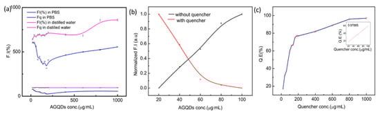 (a) Comparing the Fluorescence intensity [F.I (%)] and quenching efficiency of different conc. of AGQDs and quencher MoS2 (1 mg/mL) in distilled water and PBS Buffer. (b) The normalized F.I (a.u) of different concentrations of AGQDs observed with and without quencher. The black line indicating the increase in Fo’ by the increase within the concentrations of AGQDs, while in the presence of quencher, the Fq’ it goes on decreases. (c) Quenching efficiency Q.E (%) (Fo − Fq/Fo × 100) of MoS2 (1 mg/mL).