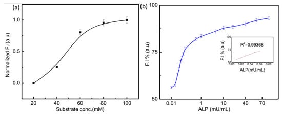 (a) Effect of substrate concentration on the enzymatic reaction between ALP and AA2P (20 mM, 40 mM, 60 mM, 80 mM, and 100 mM). (b) Enzymatic activity under different concentrations of enzyme against a fixed concentration of substrate.