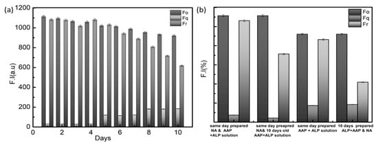 (a) Fluorescence restoration [F.I (a.u)] stability within consecutive ten days. (b) Stability of ALP –AA2P complex and AGQDs@MoS2 Nanoassembly to restore the fluorescence intensity [F.I (a.u)] against freshly prepared or ten-day-old prepared solutions.