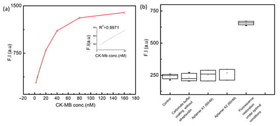 (a) The quantitative detection and qualitative analysis of CK-MB by fluorescent aptamer-based assay with a series of spiked concentrations (0 nM, 2.5 nM, 5 nM, 10 nM, 20 nM, 40 nM, 60 nM, 80 nM, 160 nM) in artificial serum. Calibrated curve for the quantitative detection of R2 = 0.9971 is presentinged. All values are means ± SD (n = 3). (b) Different parameters of the as-say were controlled for the specificity of the assay developed ion the plate.