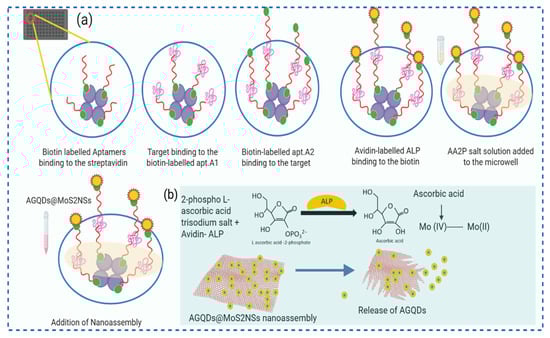 In this method, we leverage strong electrostatic interactions to create the nano assembly of MoS2 nanosheets (MoS2NSs) and aminated graphene Quantum dots (AGQDs). This graphene-like two-dimensional material has previously been employed as a quencher in biosensing platforms designed for the detection of nucleic acids, proteins, small molecules, and metal ions [,]. Because of its extremely narrow bandgap semiconductor properties and single-layer structure, it finds diverse applications in nanoelectronics, optoelectronics, and energy harvesting, among others []. Its single-layer structure enhances the effectiveness of electron mobility in inducing quenching. Graphene quantum dots (GQDs) exhibit superior qualities compared to organic dyes and semiconductor quantum dots (QDs), including remarkable photostability against photobleaching and blinking, biocompatibility, and low toxicity []. In contrast to carbon dots, graphene quantum dots (GQDs) incorporate a graphene structure, regardless of their size, which imparts to them certain distinctive characteristics of graphene []. The process of amination shifted the surface charge of the GQDs from negative to positive, rendering them environmentally friendly and reducing their cytotoxicity []. Following the creation of the nanoassembly, the Forster resonance energy transfer (FRET) interaction between AGQDs and MoS2 NSs will lead to the quenching of AGQD fluorescence. In our assay, we used this quenched nanoassembly for signal restoration. Concurrently, alkaline phosphatase (ALP) catalyzes the hydrolysis of 2-phosphoascorbic acid (AA2P) to generate ascorbic acid (AA). AA can induce the disintegration of MoS2 NSs into nanoribbons []. We used this enzymatic hydrolysate for FRET establishment for quenched nanoassembly. Using the signal generation approach outlined earlier, a highly sensitive aptamer-based fluorescent assay for CK-MB monitoring was effectively established. An aptamer-based fluorescent assay for very sensitive monitoring of CK-MB was successfully developed.