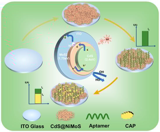As a typical II-VI semiconductor, cadmium sulfide (CdS) can be solvothermally modulated in crystallographic orientation to form multilevel microstructures ranging from nanorods to hexagonal prisms. Its unique carrier mobility and narrow bandgap of 2.4 eV endow the material with excellent photoresponsivity [34,35]. Molybdenum disulfide (MoS2) has become a hotspot in the study of transition metal sulfide compounds by virtue of its unique 1.75–2.1 eV tunable bandgap and interlayer quantum-limited-domain effect, which exhibits a significantly enhanced carrier separation efficiency in the visible region [36]. While both sulfides have demonstrated exceptional performance in photocatalytic antibiotic degradation, their integration with molecular recognition elements remains largely unexplored. Particularly, the development of aptamer-functionalized PEC biosensors for CAP detection has rarely been reported [37,38,39].
