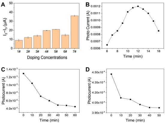 Film formation optimization of photosensitive nanomaterials is essential to achieve stable nanofilms with consistent performance. Hence, we explored four film-forming techniques for the photosensitive nanomaterial, as illustrated in Figure 4A. The drop-coating method resulted in inadequate film formation, prone to peeling off during testing and dispersing in the solution. Similarly, the PVDF-based method could not form a uniform coating even after ultrasonic treatment. The Nafion method, while advantageous due to its ease of application, adjustable concentration, and rapid processing time, suffered from non-uniform film deposition, leading to detachment in liquid environments over extended periods. The electroplating method involved dissolving the material in acetone and iodine solution for double electrode plating. Although resulting in a thin, uniform coating resistant to detachment, this method is time-consuming.