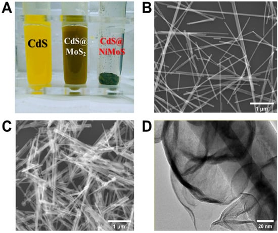 (A) The physical diagram of the fabricated photosensitive nanomaterial; (B,C) SEM images of CdS nanorods and CdS@NiMoS nanorods, respectively; (D) TEM image of CdS@NiMoS nanorods.