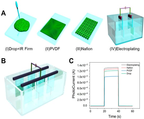 To avoid this problem, Figure 4B demonstrates our innovative redesign of the conventional reaction cell, where strategic partitioning created three independent reaction zones. By integrating this modified cell with a multi-channel electrochemical workstation, we achieved synchronous electrochemical deposition across all compartments. This optimization enhanced sample preparation throughput from one sample per 10 min to nine samples per 10 min, representing a 9-fold increase in experimental efficiency. Comparative analysis of the photocurrent response characteristics is shown in Figure 4C, and the performance is as follows: electroplating > Nafion drop-casting > ethanol drop-casting > PVDF method.