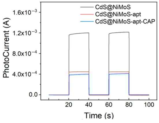The photocurrent responses of different electrodes in 0.1 M PBS containing 0.1 M NaSO3 are shown in Figure 5. The CdS@NiMoS nanorod-modified electrode prepared by electrodeposition exhibits significantly enhanced and stable photocurrent generation. This phenomenon primarily originates from two mechanisms: (1) the transition metal sulfide coating effectively promotes the separation of photogenerated electron–hole pairs while substantially suppressing their recombination; (2) the iodide-assisted electrodeposition process enables robust bonding between the photosensitive material and ITO substrate, ensuring structural stability of the modified layer. During the aptamer modification stage, the ferrocene groups establish efficient electron transfer channels with the photosensitive material layer, significantly improving the electron conduction efficiency of the system and consequently enhancing the photocurrent intensity. After CAP introduction, the specific binding between aptamers and target molecules weakens the electronic coupling at the ferrocene/photosensitive material interface, obstructing the electron transport pathway and ultimately leading to reduced photocurrent signals.