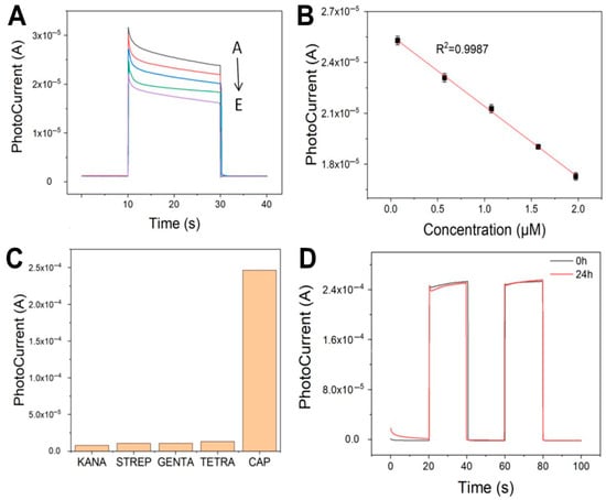 (A) Photocurrent response of the fabricated PEC-aptasensor to varying concentrations of CAP (A–E: 0.1, 0.5, 1, 1.5, and 2 μM). (B) The linear relationship between photocurrent and CAP concentration. (C) Selectivity measurement of PEC-aptasensor. (D) Stability measurement of PEC-aptasensor.