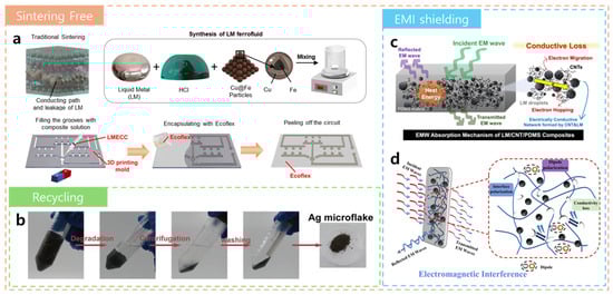 Recent advances in LM hybrid filler composites. (a) A schematic diagram showing the preparation of a highly stretchable and conductive LME composite without the need for subsequent sintering (top) and the use of the LM ferrofluid to form a patterned circuit (bottom) [54]. (b) A schematic diagram showing the fabrication process of an LM-PHEA-Ag hydrogel and the recycling of Ag flakes [55]. (c) A schematic diagram showing the improvement in EMW absorption via a CNT-induced enhancement in the composite’s electrical conductivity [56]. (d) A schematic illustration of the EMI shielding mechanism in a PVA/LM/Ni composite film [57].