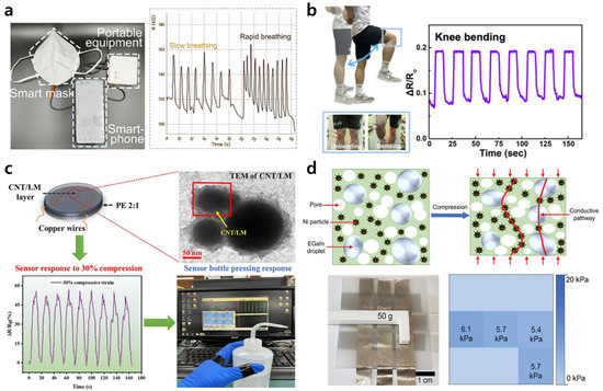 Applications of LM composites in physical motion monitoring. (a) An LM/PPy/TPU composite membrane attached inside an N95 mask (left) to monitor the variation in relative resistance during human respiration, with the data (right) being accessible via a smartphone [67]. (b) The relative resistance response of an LM/CNT/PDMS composite-based strain sensor to knee movements [56]. (c) A PET/CNT/LM/PE composite sensor (upper left), along with a TEM image of the component CNT/LM particles (upper right), a graph showing the electromechanical performance under 30% compressive strain (lower left), and a photographic image showing the real-time measurement of physical movement (bottle pressing) [68]. (d) A schematic illustration (top) showing the positive piezoconductive effect of a porous composite due to enhanced conductive pathways under compression, along with a photographic image (bottom left) and corresponding plot (bottom right) showing how the composite-based 3 × 3 sensor array enables the real-time sensing of pressure distribution [69].