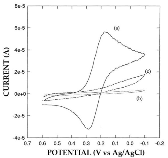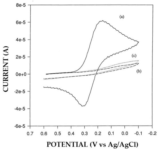 Figure 2. Typical cyclic voltammograms of potassium ferricyanide 5 mM in phosphate buffer (pH 7, I 0.1 M) on bare Pt electrode (a) and Pt-modified electrodes with poly-o-aminophenol (PoAP) before (b) and after (c) the current pulse application for EPD enzyme immobilization. The scan rate was 50 mV/s and the electrode diameter 3 mm; other conditions as described in the Materials and Methods section.