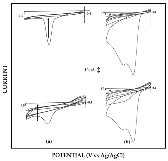 Figure 3. (a) Left panels—Typical cyclic voltammograms relevant to the electrosynthesis of poly-2-naphtol (P2NAP) from a solution of 2-naphtol 5 mM in phosphate buffer (pH 7, I 0.1 M) on bare Pt electrode (upper panel) and Pt-modified electrode by in situ co-crosslinking of GOD and BSA by EPD (lower panel). (b) Right panels—Typical cyclic voltammograms relevant to the electrosynthesis of poly-o-phenylenediamine (PoPD) from a solution of o-phenylenediamine 5 mM in phosphate buffer (pH 7, I 0.1 M) on bare Pt electrode (upper panel) and Pt-modified electrode by in situ co-crosslinking of GOD and BSA by EPD (lower panel). In all panels, the arrows show the time course of scan cycles. The scan rate was 50 mV/s and the electrode diameter 3 mm; other conditions as described in the Materials and Methods section.