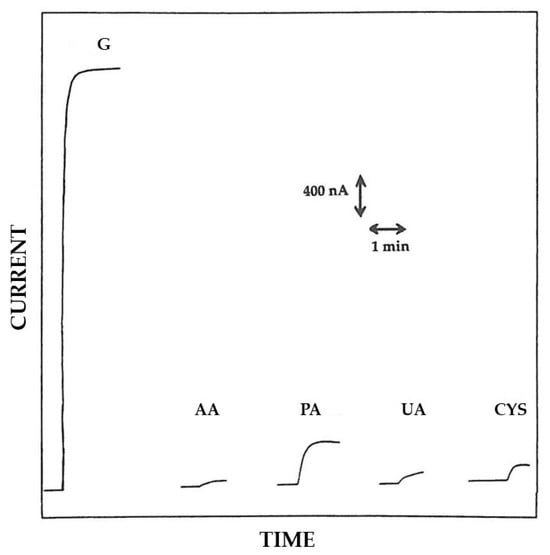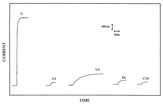 As pointed out above, biosensors obtained by in situ co-crosslinking of GOD and BSA by EPD on bare Pt electrodes followed by electrosynthesis of the polymer on these enzyme-modified electrodes, i.e., the Pt/GOD/polymer biosensors, are expected to show an improved selectivity towards interferences. Indeed, the current pulses, used in the galvanodynamic technique for the EPD-assisted enzyme immobilization, which have proved to modify significantly the nature and the permselective properties of the electrosynthesized polymers, were applied well before their electrosynthesis for this biosensor assembly. To confirm this, a Pt/GOD/PoAP biosensor was studied and their analytical performances compared to the previous Pt/PoAP/GOD electrode.