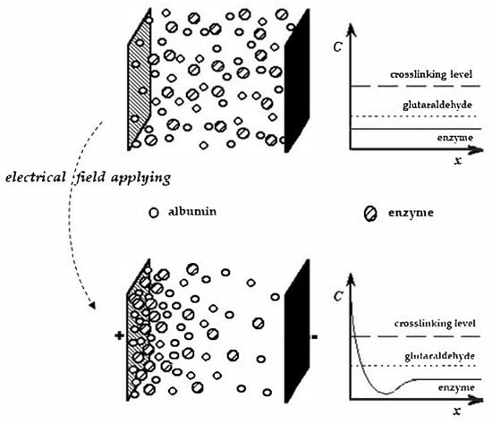 In a recent paper from our laboratory [23], an original method for enzyme immobilization, we call “electrophoretic protein deposition assisted in situ co-crosslinking enzyme immobilization”, almost promising for the above purposes, was developed and deeply studied. Here, the well-known electrophoretic deposition (ED) [24,25], where charged particles (ions or surface charged colloids) migrate, permitting their deposition onto the surface of an electrode of opposite charge, was applied to proteins and enzymes, thus realizing what is known as electrophoretic protein deposition (EPD).
