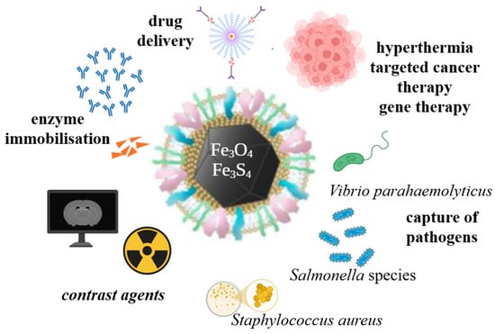 Schematic representation of magnetosome containing magnetic crystals (in the form of magnetite (Fe3O4) or greigite (Fe3S4)) and their promising applications in the biomedical field.