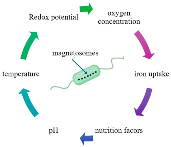 MTB have garnered significant attention in recent years due to their unique characteristics, which distinguish them from other microorganisms, and particularly because of their diverse applications, especially in the medical and ecological domains. Their inherent magnetic properties place MTB at the forefront of preferences, surpassing other microorganisms and synthetic nanoparticles in various contexts. These bacteria are prokaryotic, Gram-negative organisms, exhibiting motility via flagella. They are capable of synthesizing intracellular magnetic crystals, with nanometric dimensions, composed of magnetite, iron oxides (Fe3O4), and/or greigite, iron sulfates (Fe3S4), which are surrounded by a lipid bilayer membrane (Figure 1). This membrane forms specialized organelles known as magnetosomes []. The formation and development of magnetosomes are strongly influenced by environmental conditions. Factors such as nutrient absorption, including iron and oxygen, carbon sources, as well as fluctuations in pH and temperature, directly impact the mineral composition synthesized by the bacteria and, consequently, the formation of magnetosomes (Figure 2) [].