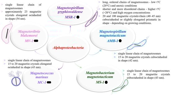 In recent years, over 16 new MTB species have been discovered in mountain environments [,]. However, cultivating these species under laboratory conditions remains a significant challenge that requires further investigation. In contrast, species of magnetotactic bacteria that have been studied extensively, with well-established cultivation protocols, belong to the genus Magnetospirillum (class Alphaproteobacteria, phylum Proteobacteria), including strains such as Magnetospirillum magneticum (AMB-1), M. magnetotacticum (MS-1), and M. gryphiswaldense (MSR-1). In this regard, the species found in Figure 3 are those that have received the most concentrated attention from the scientific community both in terms of establishing cultivation protocols, respectively, identifying the conditions conducive to their growth in laboratory conditions, as well as in terms of the quality of the information obtained from their analysis. From the steps undertaken and from the research carried out, information was mainly obtained regarding the shape of the crystals contained by these species, the number of magnetosomal chains, as well as the size of the magnetic crystals contained [].