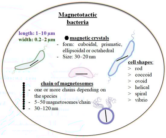 In all magnetotactic bacteria, magnetosomes are organized into single or multiple chains that are aligned in a manner similar to actin filaments []. The size and shape of magnetosomes, as well as the nanoparticles within them, are of great significance in the characterization of MTB and in understanding the mechanisms that underlie their principal functions. These characteristics are crucial for elucidating the bacteria’s potential applications across various sectors.