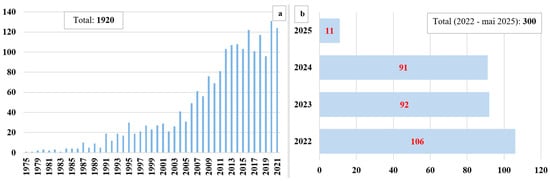 Schematic representation of the number of publications registered in the scientific database, Web of Science (1920), since the discovery of magnetotactic bacteria (a) and in the last 40 months (January 2022–May 2025) (b).