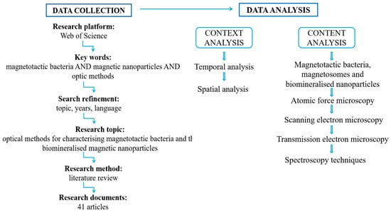 Following a systematic review of the selected publications concerning the methods for analyzing, characterizing, and evaluating magnetotactic bacteria and their biomineralized nanoparticles, the gathered information was organized based on both context and content analysis parameters (Figure 6). The context analysis was performed by examining the spatial and temporal aspects, with the aim of highlighting the ongoing and consistent research focused on the applicability of magnetotactic bacteria. Meanwhile, the content analysis was structured around the central research topic and the emerging variables: the characteristics of magnetosomes and magnetic nanoparticles biomineralized by magnetotactic bacteria, and the optical and microscopy techniques employed for their evaluation, analysis, and characterization.