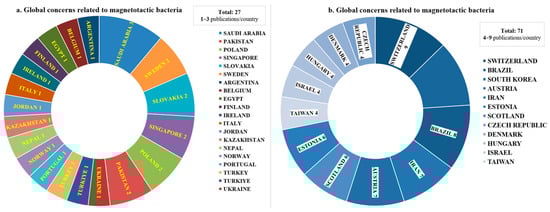 The context analysis was conducted based on the temporal and spatial criteria of the identified sources. As shown in Figure 5b, during the years 2022, 2023, 2024, and until May 2025, interest and research related to these bacteria have remained consistently high, reflecting both the ongoing progress in the field and the determination to fully explore the potential applications of magnetotactic bacteria. Additionally, Figure 7 illustrates the global distribution of research published in recent years, which is indicative not only of the widespread interest in the subject but also of the ubiquitous distribution of magnetotactic bacteria. This is further demonstrated by the identification and characterization of new bacterial strains during the period from 2022 to May 2025.