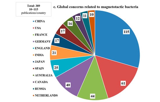 Shortly after their discovery in the late 1950s, magnetotactic bacteria were initially believed to be confined to sediments and aquatic environments with near-neutral pH values and temperatures within the typical range []. However, subsequent research has demonstrated that their distribution is, in fact, ubiquitous. These bacteria can be found in a wide variety of natural habitats, including aquatic environments, moist soils, lakes, and both freshwater and saline ecosystems, as well as in extreme environments [,]. Extensive studies have been conducted on their distribution across numerous locations, providing global coverage, including regions such as the Brazilian and Pacific lagoons, the China Sea, the North Sea, rivers and lakes across Asia, as well as in both European (Germany, France, Italy, Portugal, Spain, United Kingdom, Russia) and American continents [].