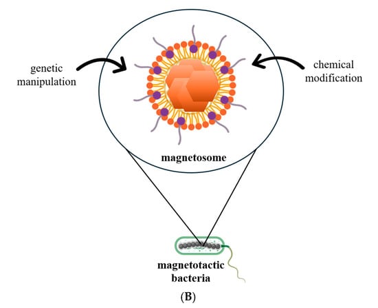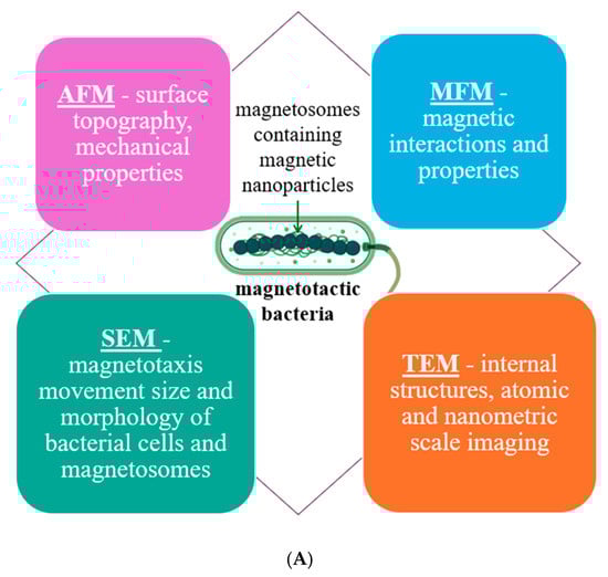 While other techniques may also be utilized (metagenomics, single-cell genomics, or CRISPR-Cas9 and genetic engineering) (Figure 8B), this review focuses primarily on those methods that help describe the morphology, shape, and size of the nanoparticles contained within these bacteria, as these aspects are crucial in defining the performance of magnetotactic bacteria in various applications.