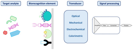 A biosensor is a compact analytical device designed to translate biochemical or chemical interaction into a measurable output signal, commonly optical, electrical, or acoustic, that correlates with the concentration of a specific target. The output originates from a selective recognition event, such as a molecular binding or reaction involving the analyte of interest [76]. Figure 1 illustrates a typical biosensor, highlighting its three essential components and their functional roles in the sensing process.