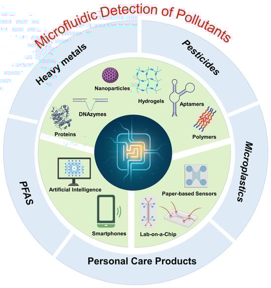 Schematic illustration of microfluidic sensors for micropollutant detection. At the core, microfluidic platforms serve as the foundational technology enabling integrated environmental sensing. Surrounding components represent key elements that enhance biosensing performance and portability, including smartphone-based interfaces, artificial intelligence (AI), and lab-on-a-chip systems, as well as functional biorecognition elements such as DNAzymes, aptamers, proteins, polymers, hydrogels, and nanoparticles. The schematic also illustrates the primary classes of targeted micropollutants: heavy metals, pesticides, per- and polyfluoroalkyl substances (PFAS), microplastics, and personal care products (PCPs).